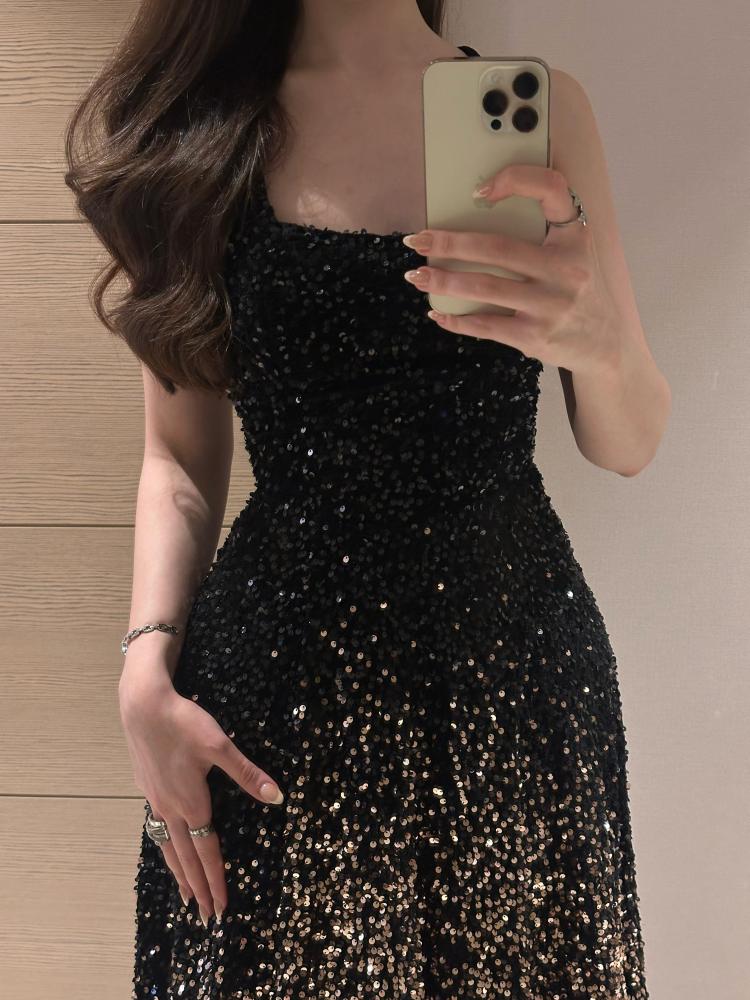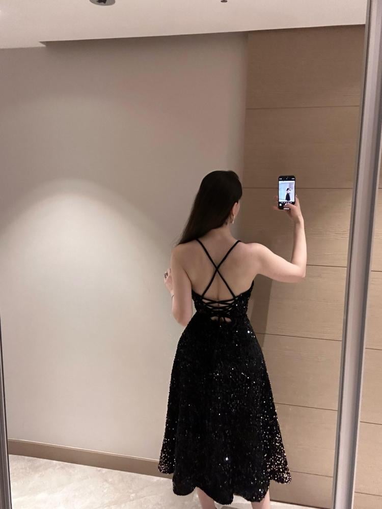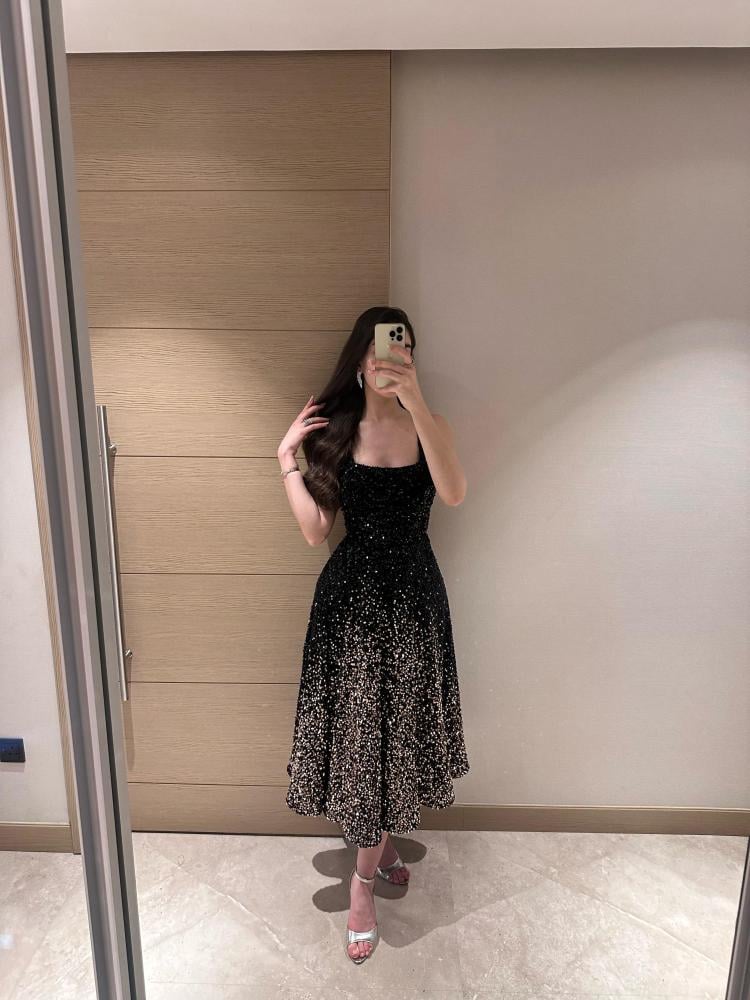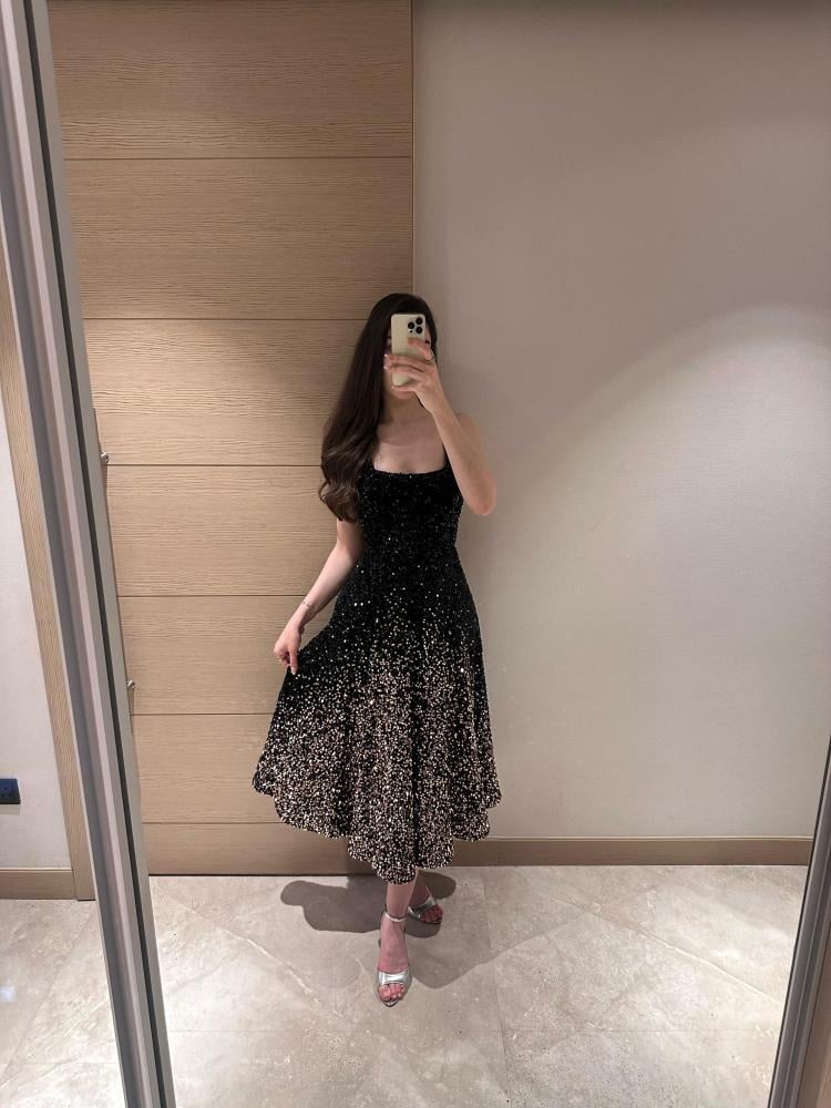 فستان سهرة أنيق مصنوع من قماش الترتر الأسود اللامع بتدرج براق من الأعلى إلى الأسفل، يمنح إطلالة فخمة وجذابة. يتميز بتصميم متوسط الطول يصل إلى أسفل الركبة، مع قصة ضيقة من الأعلى تنحت الخصر ثم تنسدل بتنورة واسعة بانسيابية راقية.